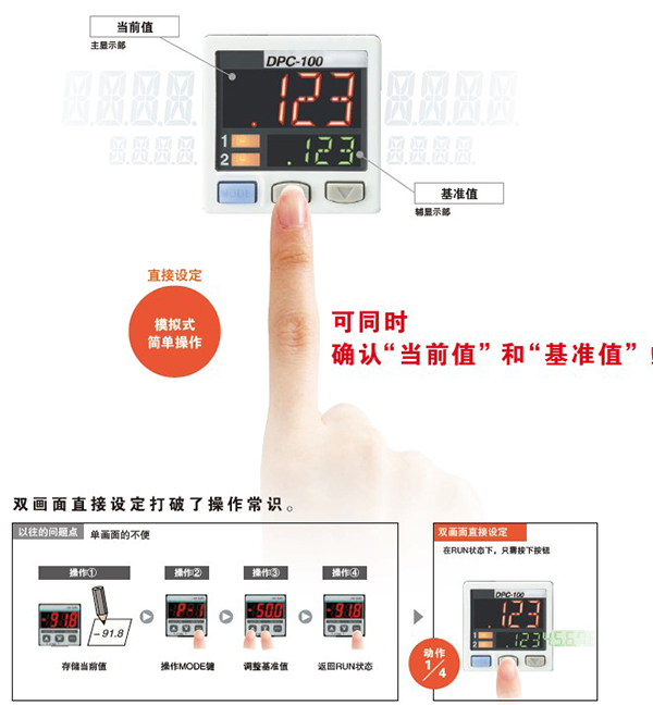 可区分使用在装置的总压力变化时,通过外部输入将比较输出的判定基准转移总压力变化值进行修正的自动参照功能,以及可将显示值修正为零的远程调零功能。可有效用于总压力变化剧烈的部位,以及要求精细设定的部位。