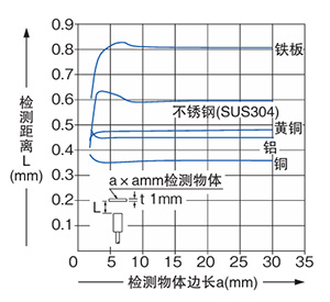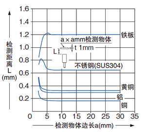 | 当检测物体的尺寸小于标准尺寸(铁板30×30×t1mm)时,检测距离如左图所示缩短。 |